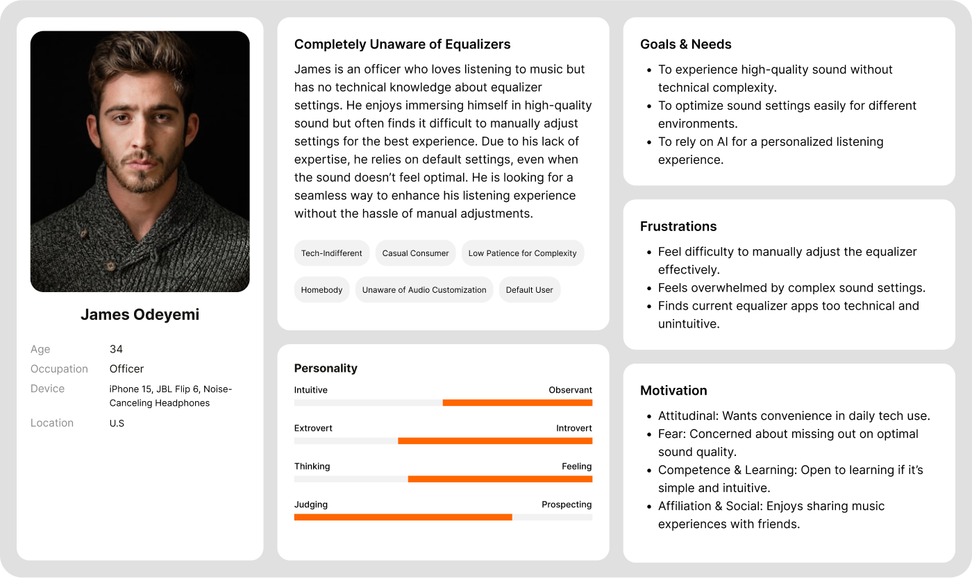 In developing this persona, I aimed to address a significant segment of users who are not audio enthusiasts but still value a good listening experience. Many consumers use speakers for entertainment at home but lack the knowledge, interest, or patience to manually adjust sound settings.