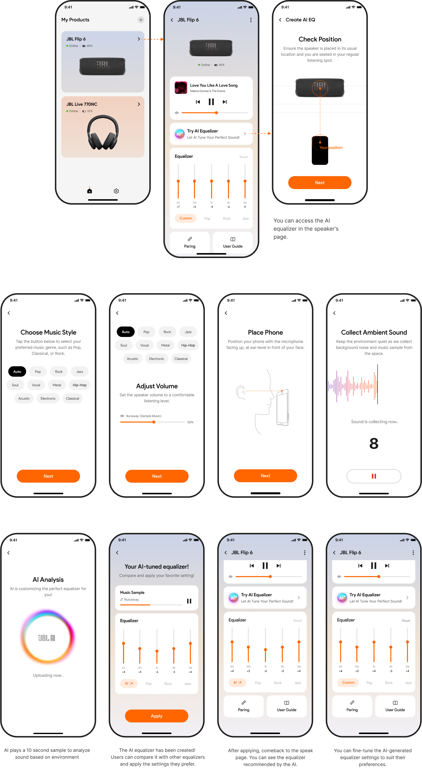 As a product designer, I conducted user research and scenario-based testing to identify key audio pain points. I then translated these insights into a smart equalizer interface that dynamically adjusts sound settings, delivering an immersive and personalized experience.